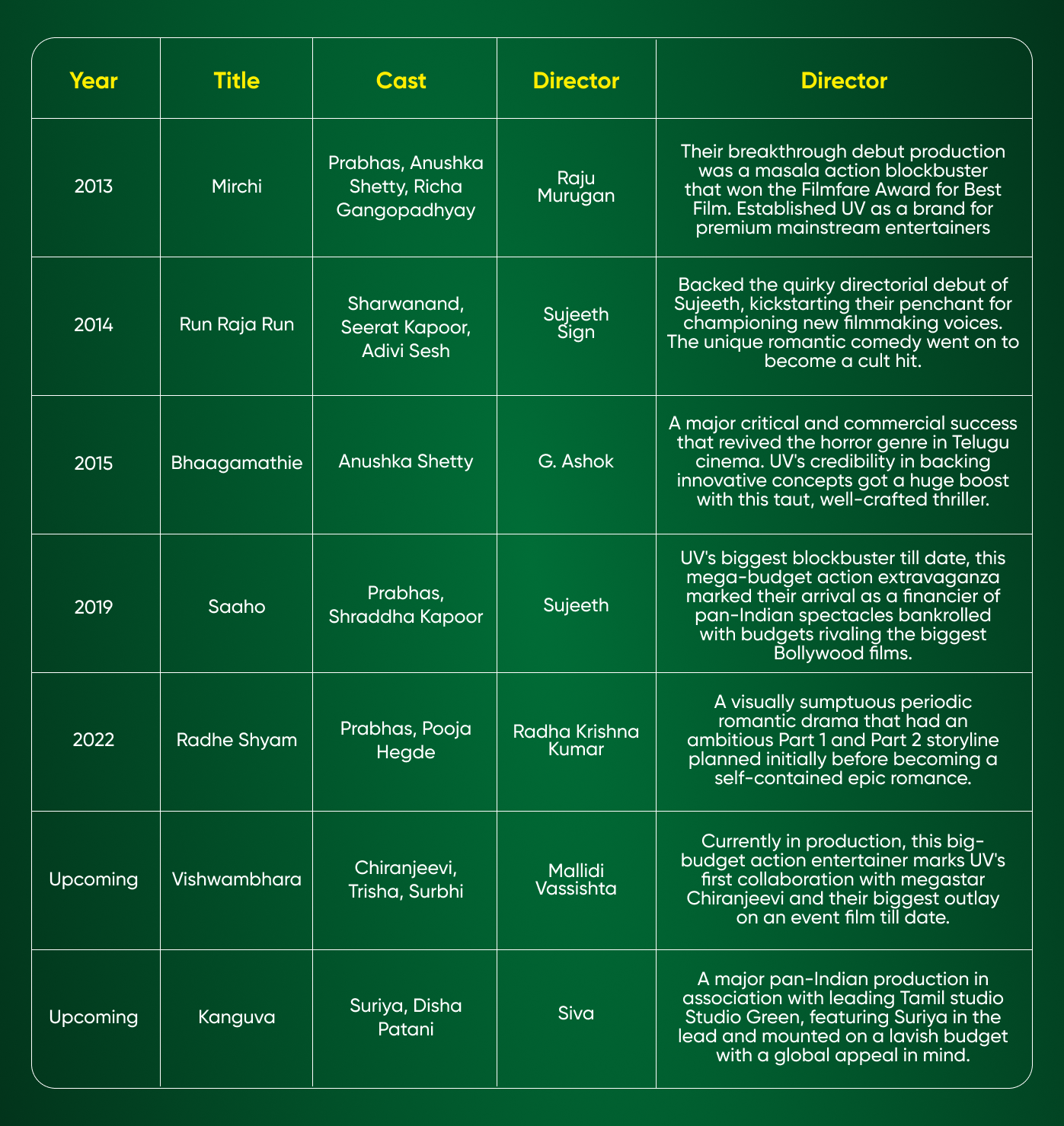 UV Creations has produced over 20 films, including major hits like "Mirchi" and "Bhaagamathie," demonstrating their impact on the Telugu cinema landscape.